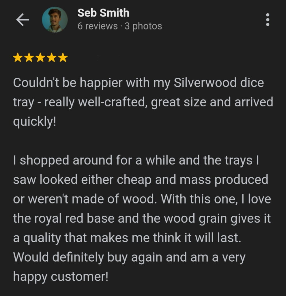 Make sure your dice always land safely and securely with a Silverwood Dice Tray. This dice rolling tray is designed to be light and fit perfectly alongside your notebook when travelling to games night – while still look amazing. Our Dice Trays are lined with ethically-sourced leather to protect your table and dice for when you need to roll.